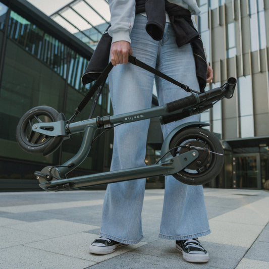 Scooters have the upper hand over bicycles when it comes to mobility and space efficiency. Movino scooters are foldable, making them perfect for even the smallest apartments. They easily fit under a bed or in a closet. Lightweight and portable, you can carry your scooter anywhere like a shoulder bag, thanks to the adjustable carrying strap. Climbing stairs with your scooter is hassle-free too.