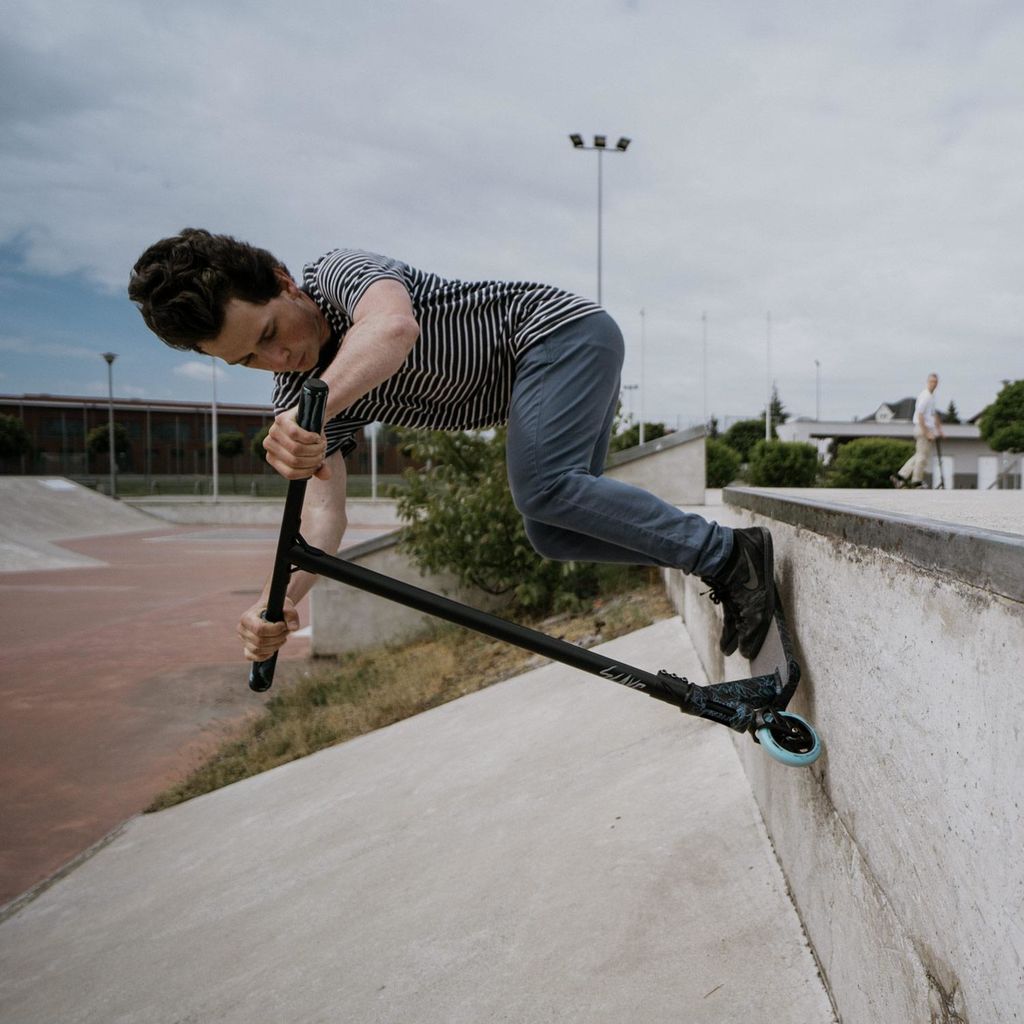 Are you looking for a scooter that excels both on the street and at the skatepark? Look no further than the Movino Slave. This model is equipped with integrated headsets, an IHC compression system, and 110 mm wheels with an aluminium core, along with a spacious street-style deck. Perform your favourite tricks without limits!