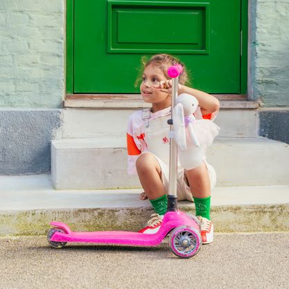 The glow-in-the-dark Ghost scooter was created with little explorers aged 2–5 in mind, children who discover the world with curiosity. The lean-to-steer system reacts to the child’s body movement, teaching intuitive riding, while the steering lock allows beginners to start by riding straight only – without the risk of sudden turns or losing balance.