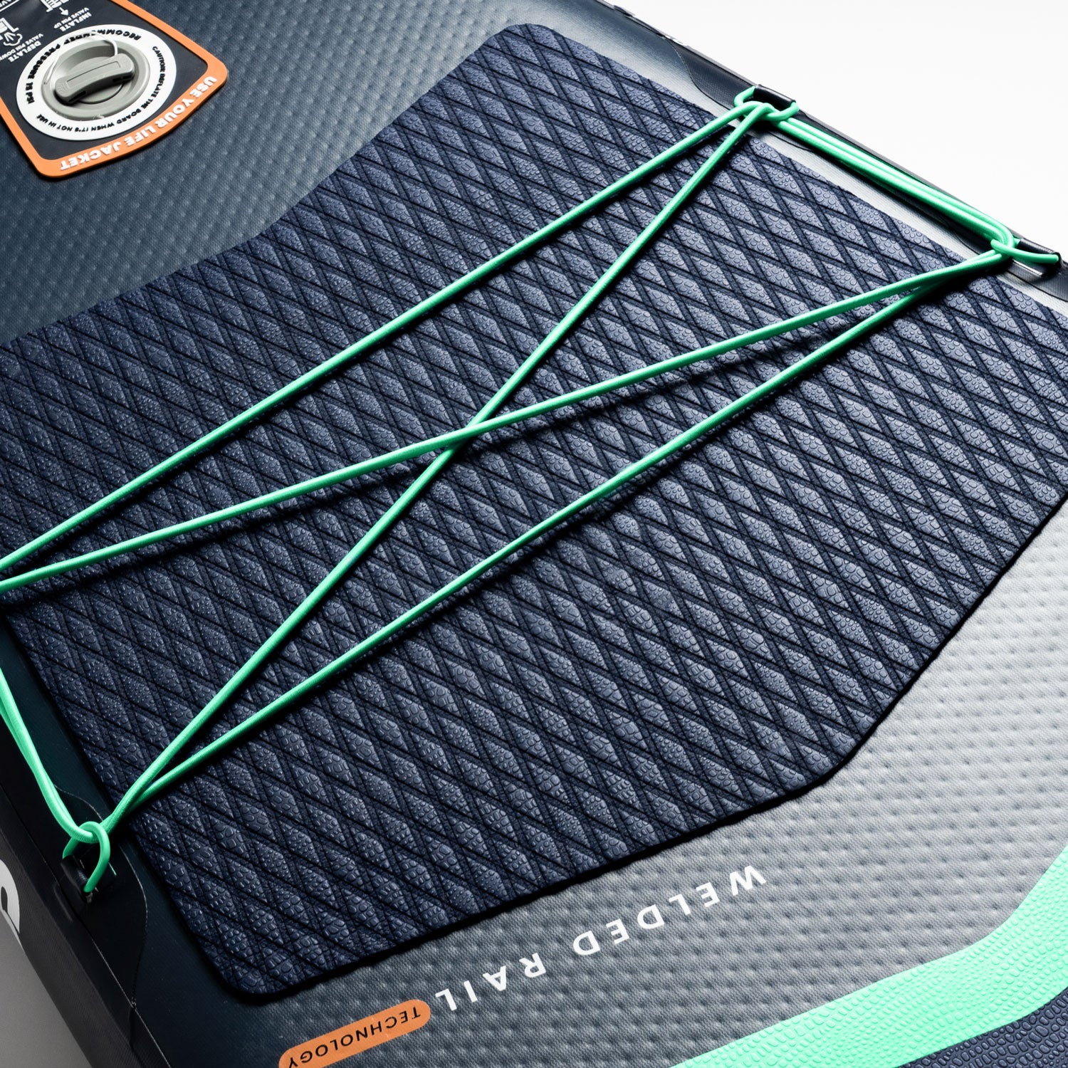 Das Board verfügt über Staubereiche vorne und hinten. Elastische Seile und stabile D-Ringe ermöglichen die sichere Befestigung eines Rucksacks, einer wasserdichten Tasche oder der Ausrüstung für die Kleinen. So hast du alles Wichtige immer griffbereit – ordentlich und funktional.